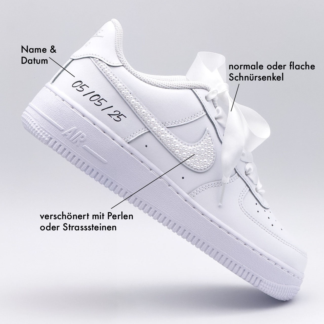 Veredelt mit liebevoll platzierten Strasssteinen auf dem Nike-Zeichen sowie deinem Wunschdatum und Namen auf den Seiten. Mit flachen, eleganten Satinschnürsenkeln. Ein einzigartiges Andenken, das bleibt. Die originalen Schnürsenkel von Nike liegen immer im Karton mit.