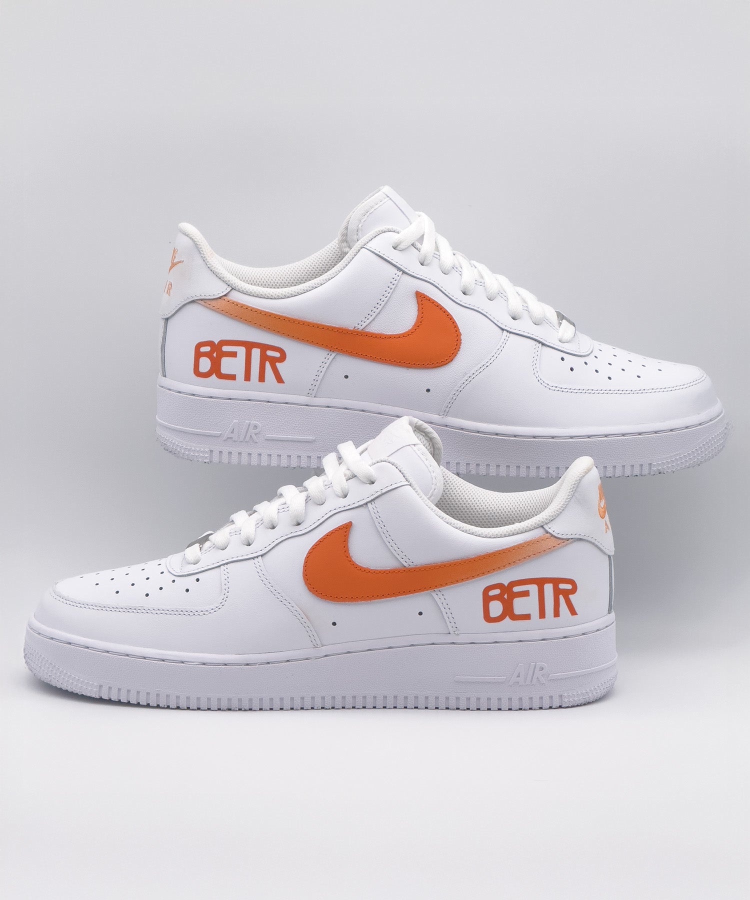 Das Nike Swoosh wurde per Airbrush mit einem sanften Verlauf von Orange ins Weiß bemalt. Direkt darunter: das BETR-Logo. Auch das Nike Air Logo hinten wurde in Orange eingefärbt.