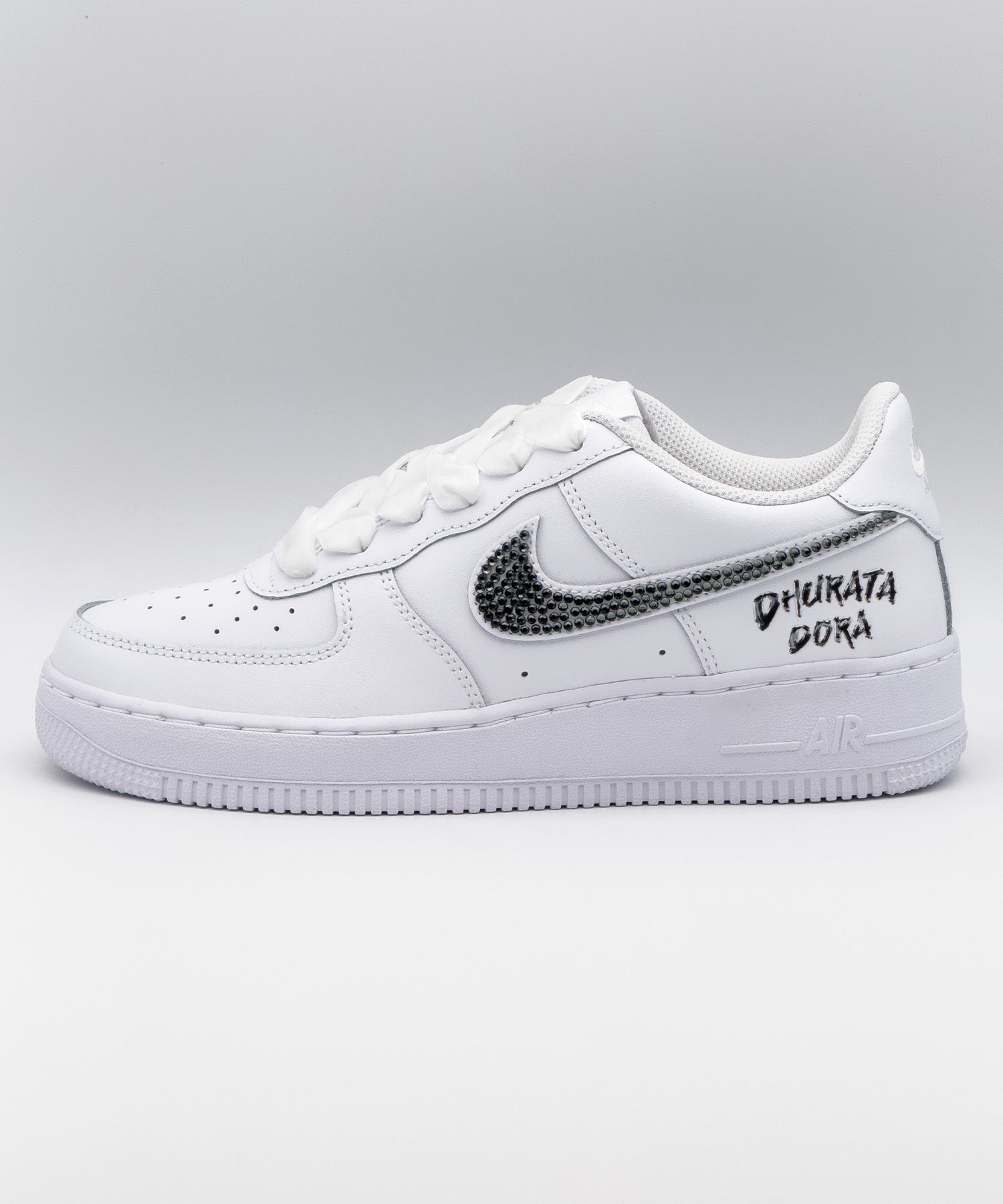 Das Nike Swoosh wurde mit glänzenden, dunkelgrauen Strasssteinen veredelt – abgestimmt auf die schimmernden Details in ihrem Logo, das seitlich auf dem Schuh platziert ist.