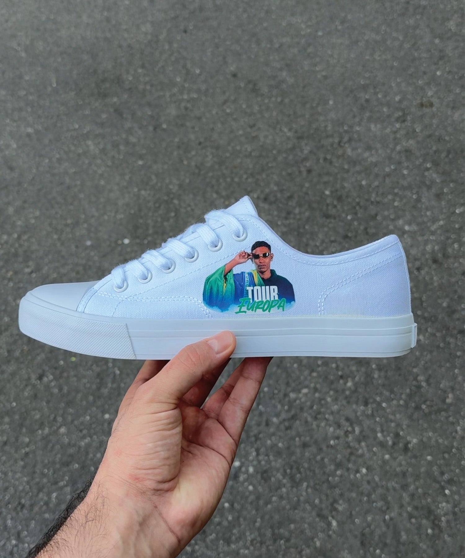 Das Bild seiner Europa-Tour wurde überarbeitet und als Highlight direkt auf dem Schuh umgesetzt – ein Custom passend zur Reise und als besondere Erinnerung.
